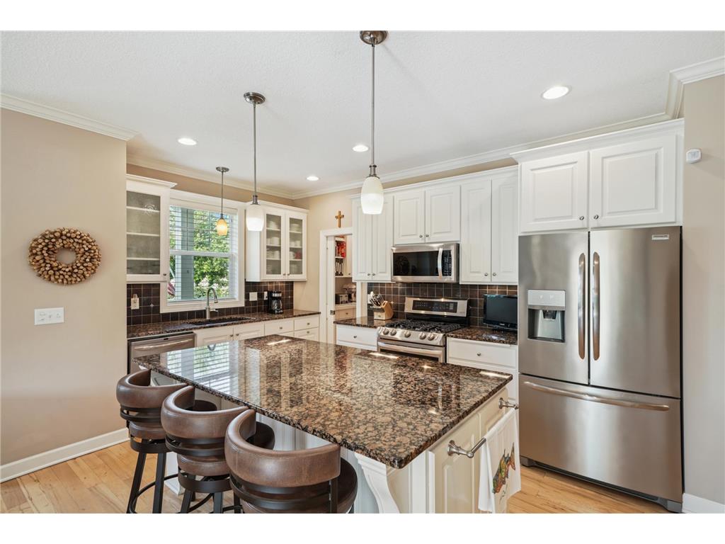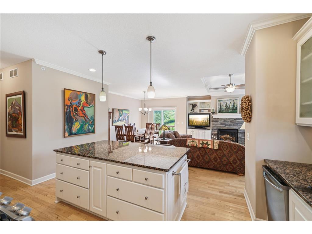 The first thing you see upon entering is the gorgeous real hardwood floors. Then you look up and see crown molding. This quality built end unit townhome does not disappoint. It is a well thought out floor plan with an open concept for the kitchen, living and dining room. The kitchen has a walk in pantry and plenty of cabinetry, all enameled white, for great storage. The primary suite has a walk in closet and walk in shower plus those gorgeous wood floors. The laundry and a 2nd bedroom finish off the main level. The lower level has a spacious family room, 2 bedrooms, and a bath. Don't forget to look in the garage where there is an abundance of custom cabinetry. Move right in and enjoy your morning coffee on the sun filled deck enjoying the birds and view. Tucked behind a hill it minimizes the noise from Hwy 5. About a 5 minute drive to downtown Chanhassen!
