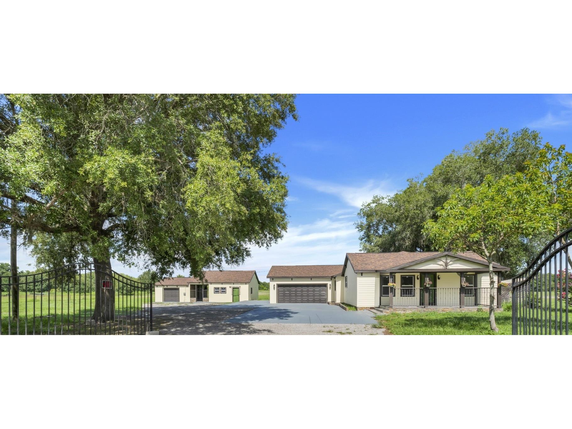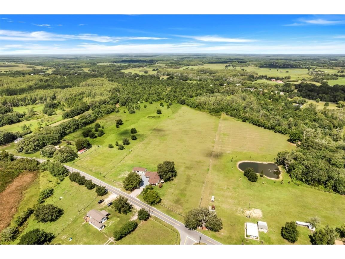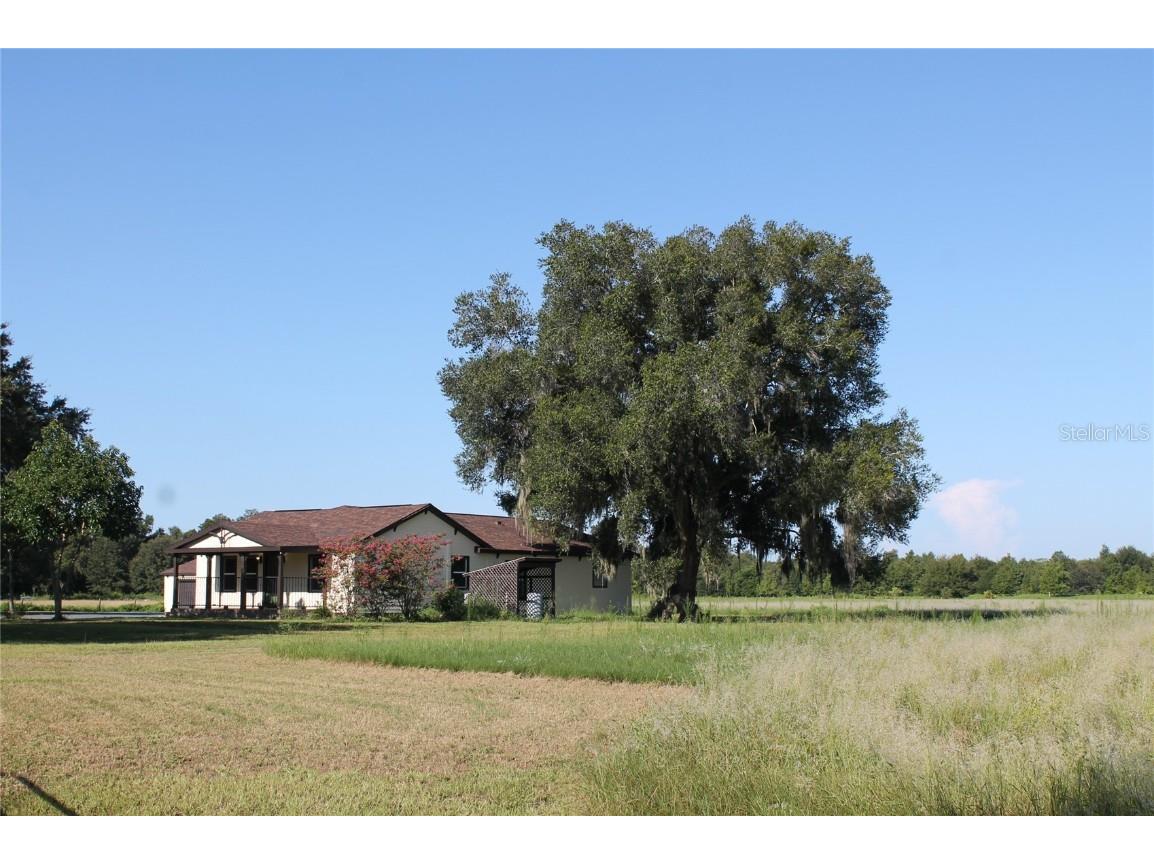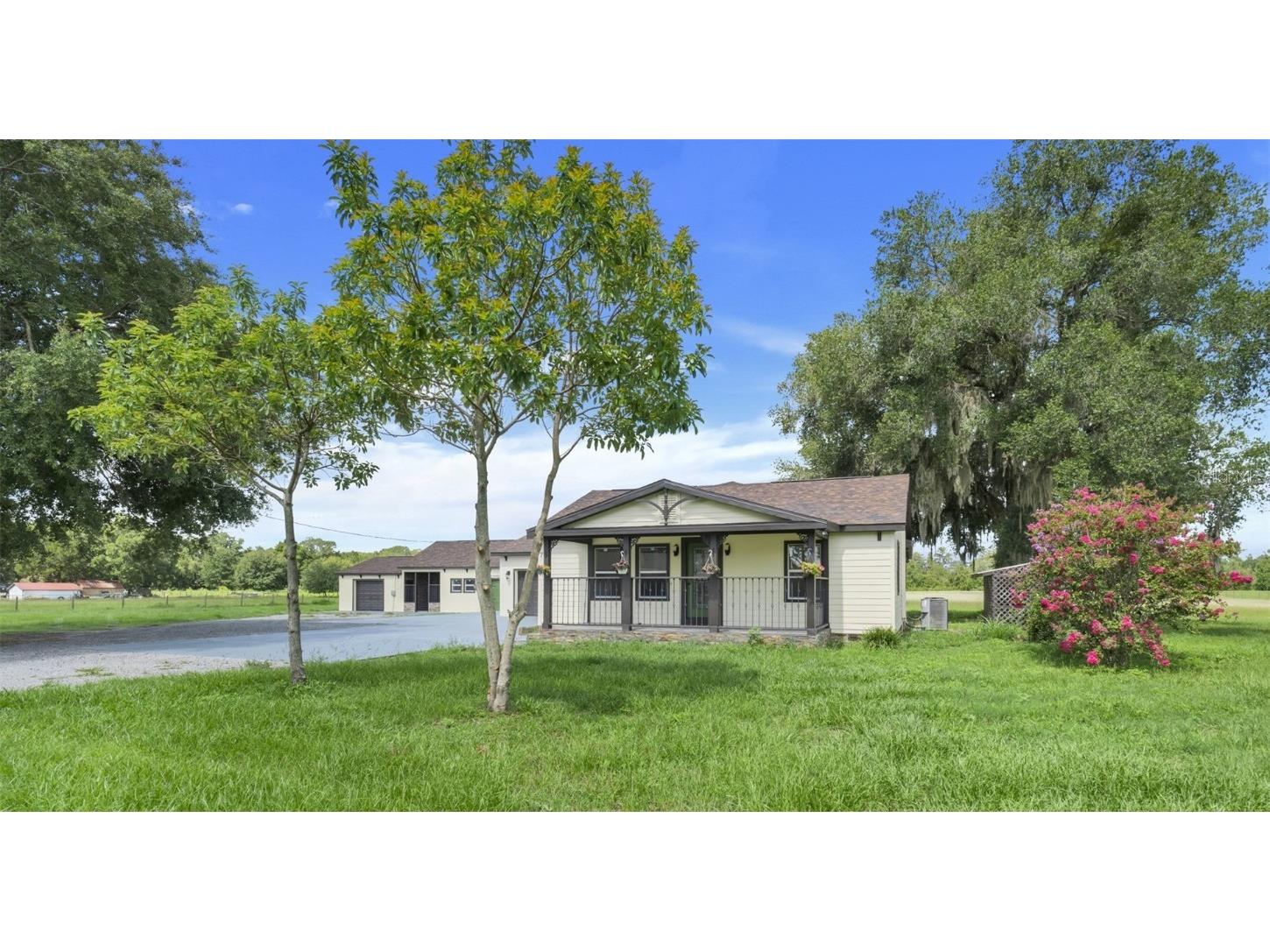 One or more photo(s) has been virtually staged. The main part of the home was built in 2006. This could be utilized as a 2 unit AirBNB. Ten acres, five Bedrooms, four Baths & two Garages make up this compound. The in-laws will love the totally renovated-free standing Studio apartment complete with a breezeway and its own 1 car garage. Ten acres of freedom at this retreat just 2.5 miles from State Rd 50, Central Florida’s main east-west corridor. This tastefully renovated 4-bedroom, 3-bathroom home, dual Master Bedrooms, complete with an oversized 2-car garage, offers unparalleled privacy and modern comfort. NOTE: with ample dry flat land for parking space and the possibilities of a free-standing workshop/storage addition, the air-conditioned suite, equipped with its own bathroom & kitchenette is also suitable as an office space, separate from the privacy of your home.... the possibilities are endless ! 2006: A major addition was made to the original home, including 2 Master Bedrooms with Baths, a living room, the laundry room and a dual entry garage. The smaller garage door has multi uses: golf cart, a rider mower and/or an all-terrain vehicle. 2023: An extensive remodel & update of both the main home and the detached in-law package was performed. The project includes brand-new ceramic and laminate flooring throughout, complemented by new appliances, new cabinets, new countertops, and bathroom fixtures. The home features new windows and has been freshly painted inside and out. Both the main house and the in-law suite boast new shingles, ensuring long-lasting protection. Enjoy the serenity of your morning coffee on the easterly facing front porch, surrounded by the sights and sounds of nature. Watch the sunsets from Westerly facing Primary Bedroom Patio. The property is secured with an automatic front gate and an upscale wooden fence along Bay Lake Road. This rural Lake County gem is equipped with a money-saving private well featuring a new pump and filtration system. With 10 acres of open space, there's ample room for horses, cows, a barn, a multi-bay utility building, tennis court or cultivate hay which commands up to $130 a roll.. Schedule your private showing today and experience the freedom and tranquility this unique property offers.