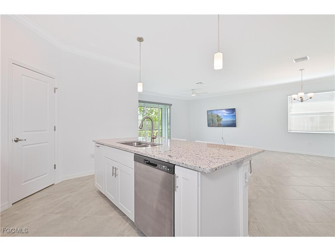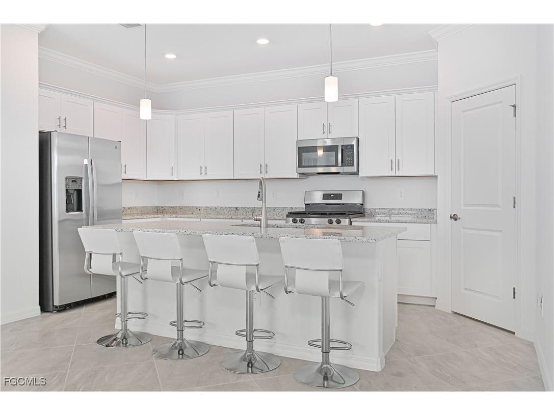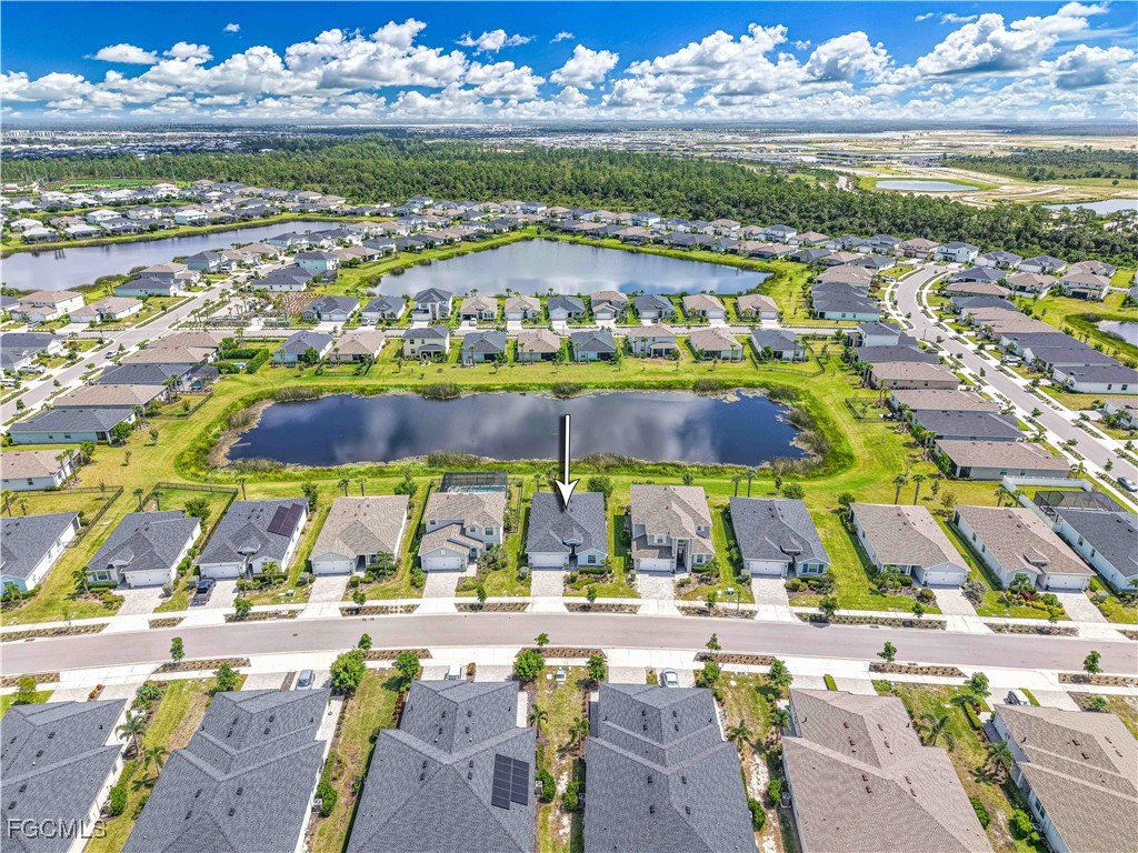 This stunning 4-bedroom, 3-bathroom home, built in 2022, offers light-filled, open-concept living with modern finishes throughout. Nestled on a waterfront lot with tranquil lake views, this home is designed for both relaxation and entertaining. Step inside to find tile flooring throughout the main living areas, plush carpet in the bedrooms, and a spacious great room that flows seamlessly into the kitchen and dining spaces. The gourmet kitchen features a large center island, perfect for gathering, sleek cabinetry, and plenty of counter space. The primary suite includes a luxurious oversized shower, walk-in closets, and serene water views. Three additional bedrooms offer flexibility for family, guests, or home office space. Enjoy Florida living year-round on the screened lanai, ideal for morning coffee or evening sunsets over the water. Additional highlights include a 2-car garage with durable epoxy flooring and plenty of storage space for tools, outdoor gear, or seasonal items. Inside, the home features neutral finishes throughout, offering a blank canvas ready for your personal style and design touches. Located in Trails Edge at Babcock Ranch, America's first solar-powered town, residents enjoy high-speed fiber internet, community parks, miles of nature trails, a vibrant town square, events year-round, resort-style pools, fitness centers, and top-rated Babcock Neighborhood Schools. Eco-friendly living meets modern convenience in this thriving, close-knit community.