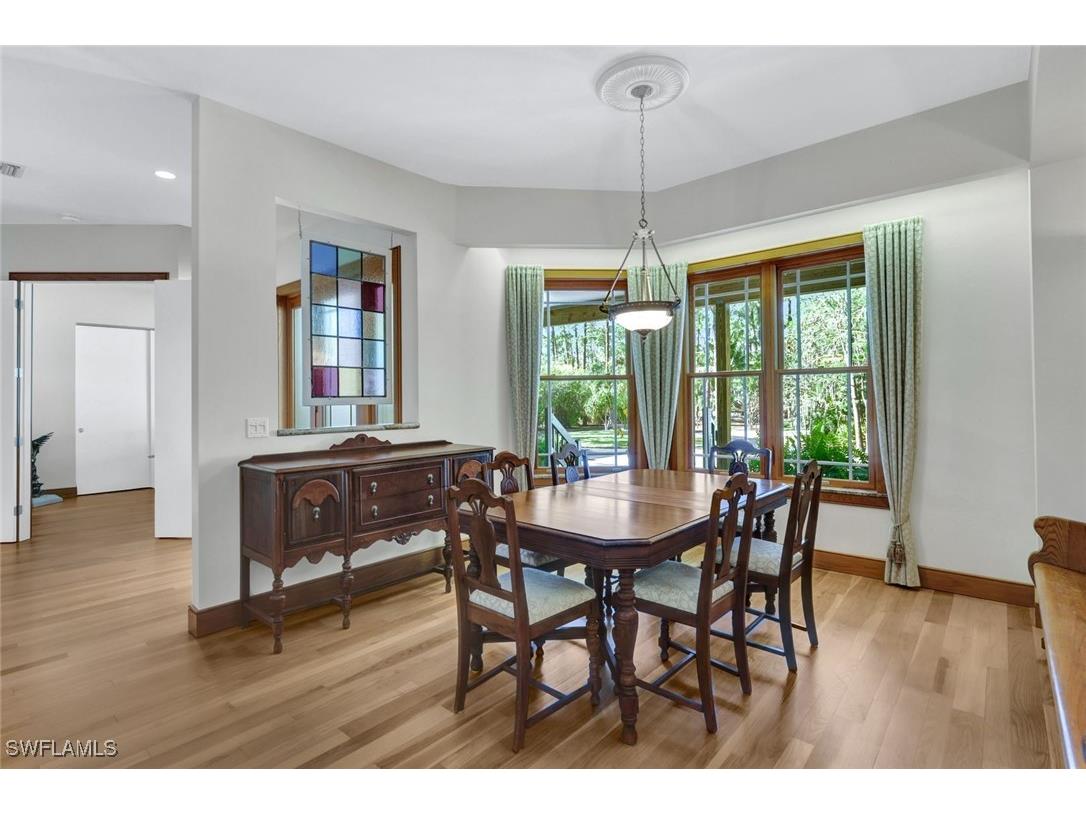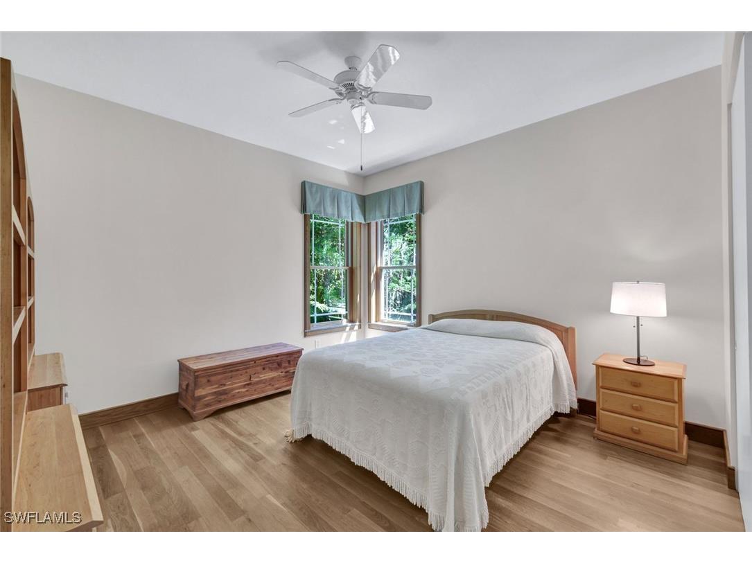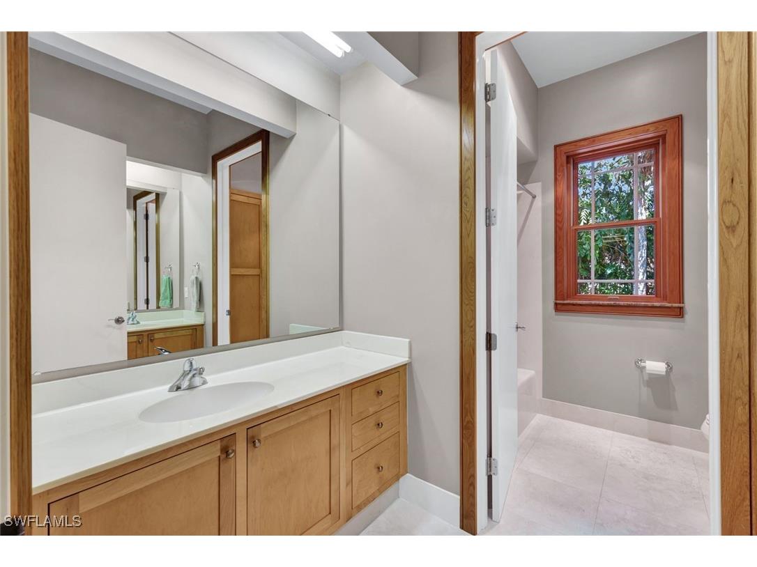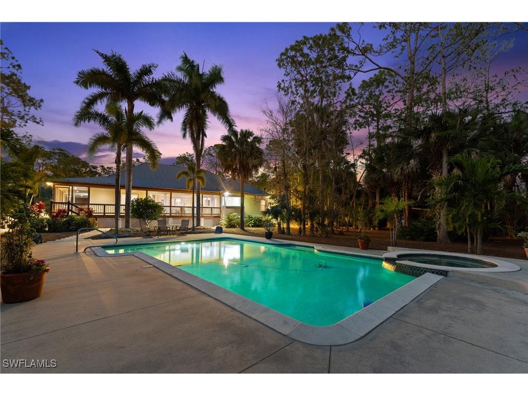 Discover a masterfully crafted Florida Vernacular estate in the heart of Oakes Estates, Naples, FL, where expert craftsmanship meets timeless design. This stunning property offers a main house, guest house, and expansive outdoor spaces, all designed with quality and longevity in mind. The main home features 3 bedrooms plus a den. Soaring 10-ft ceilings and 8-ft doors throughout create an open and airy feel, while prairie-style windows enhance its architectural charm. The interior showcases custom, locally crafted solid rock maple cabinetry and unstained white oak flooring, adding warmth and character to the home. The primary suite boasts a one-piece marble shower and a custom walk-in closet. Functionality meets convenience with a whole-house reverse osmosis system, a new exterior and interior paint job, and masonry construction. The home is designed with no interior load-bearing walls, allowing for a flexible floor plan for potential future updates. Extra-deep garages provide ample storage, and the property includes an air-conditioned shed. Additional features include a central vacuum system with a new motor, copper plumbing, a newer water heater, and a 5-ton AC. The guest house, built in 2006, offers 1,100 sq. ft. under air with 2 bedrooms and 1.5 baths. It features polished concrete floors, impact-resistant PGT windows, and high-end finishes, including granite countertops and luxury German cabinetry. Stainless steel appliances complete the modern kitchen, making it a perfect retreat for guests or extended family. Outdoor living is a dream with a 3/4 wraparound porch that exudes Florida Vernacular charm. The property includes a gunite pool with a new filter recently installed. A tranquil canal in the backyard provides a perfect spot for fishing, with large-mouth bass, peacock bass, snook, and gar frequently found in the waters. Situated in Zone X, flood insurance is not required. The home sits 50 inches above the crown of the road, ensuring an elevated and secure foundation. This estate seamlessly blends luxury, durability, and thoughtful design, creating a home that is as functional as it is beautiful. Enjoy the serene, private setting of Oakes Estates while being just minutes from Naples' world-class dining, shopping, and beaches. Schedule a private showing today and experience this one-of-a-kind property for yourself!