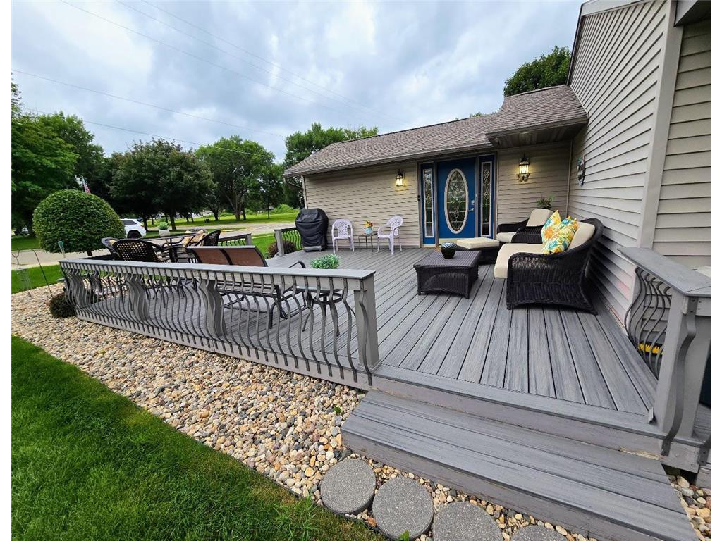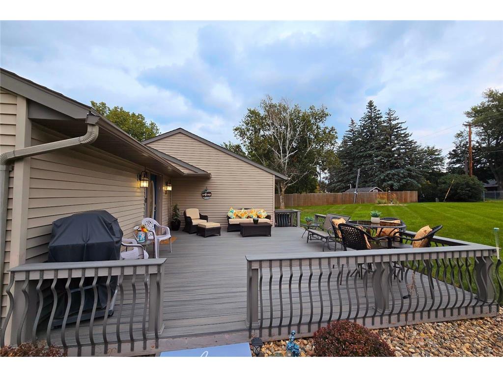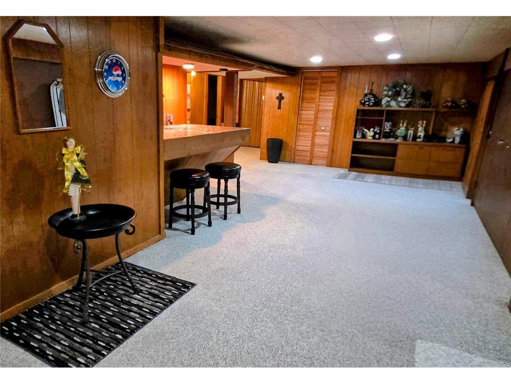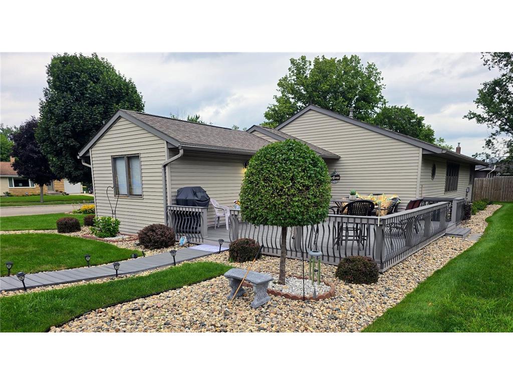 Well-maintained ranch-style home on a beautifully landscaped corner lot! This property features a spacious 18' x 22' composite deck on the southeast side—perfect for relaxing or entertaining. The main floor offers three bedrooms, an updated full bath with tub/shower, and a large carpeted living room with newer windows. The kitchen includes updated countertops, a stylish backsplash, and a dining bar that opens to a bright and spacious dining room with laminate flooring, newer windows, and direct access to the deck.The finished basement offers even more living space with a carpeted family room and built-in bar, ¾ bath, utility/laundry area (washer & dryer included), workshop/storage room, and two bonus rooms with closets. Structural steel beams were professionally installed by Complete Basement Systems along the north and west walls, with a transferable warranty for peace of mind.Additional features include vinyl siding, detached double garage, roof approx. 12 years old, two sump pumps, and a fantastic location near the hospital, park, and grocery store.