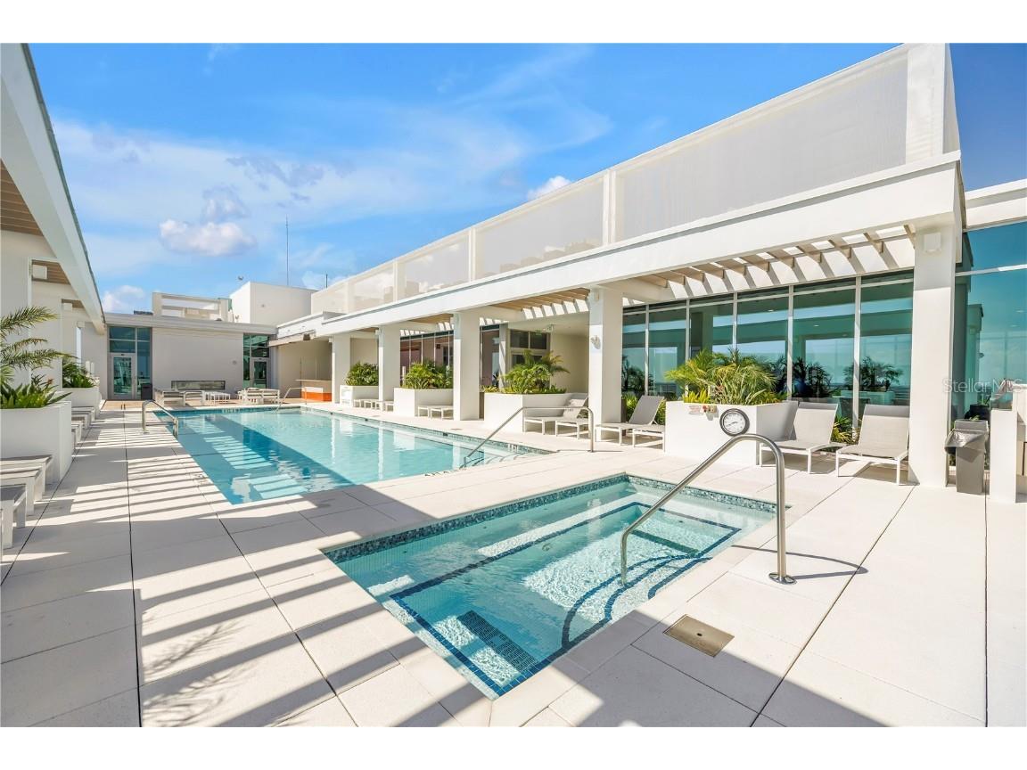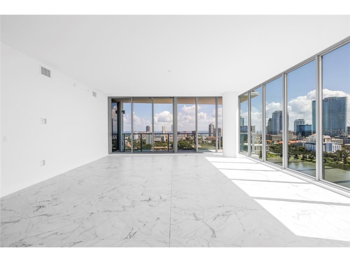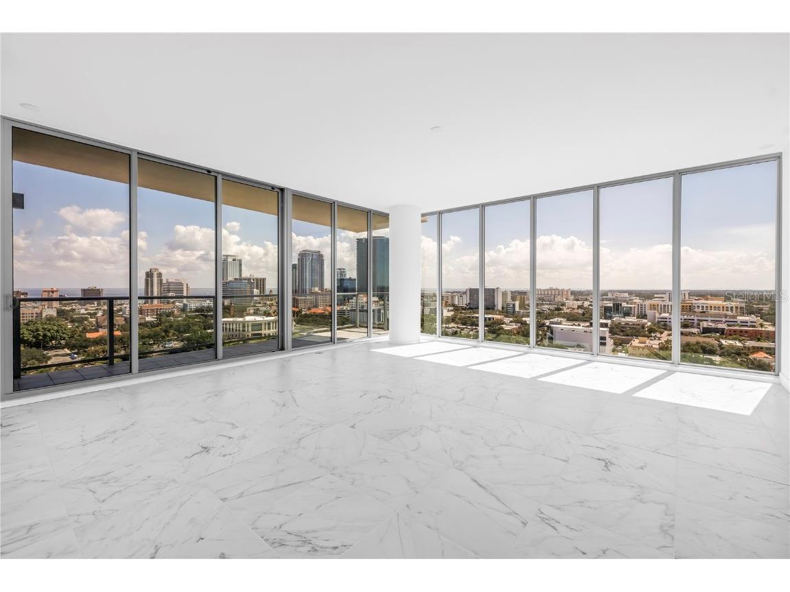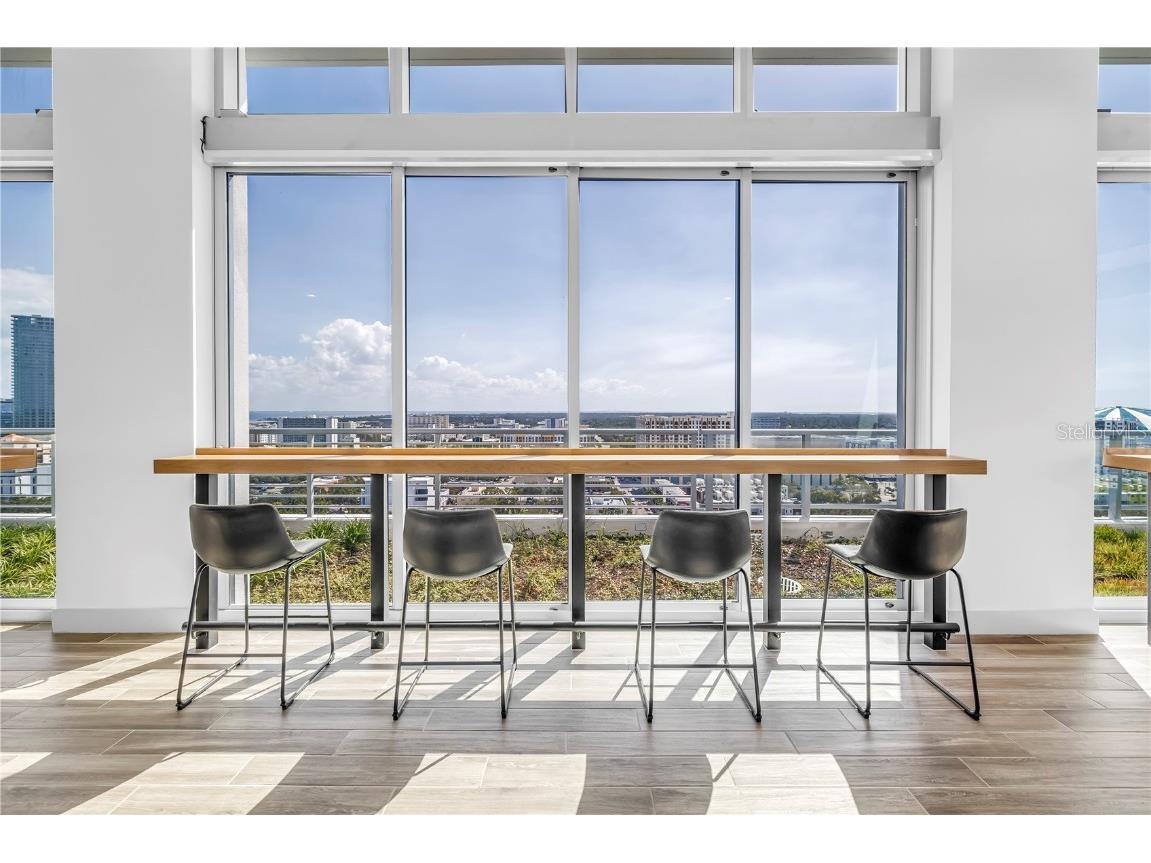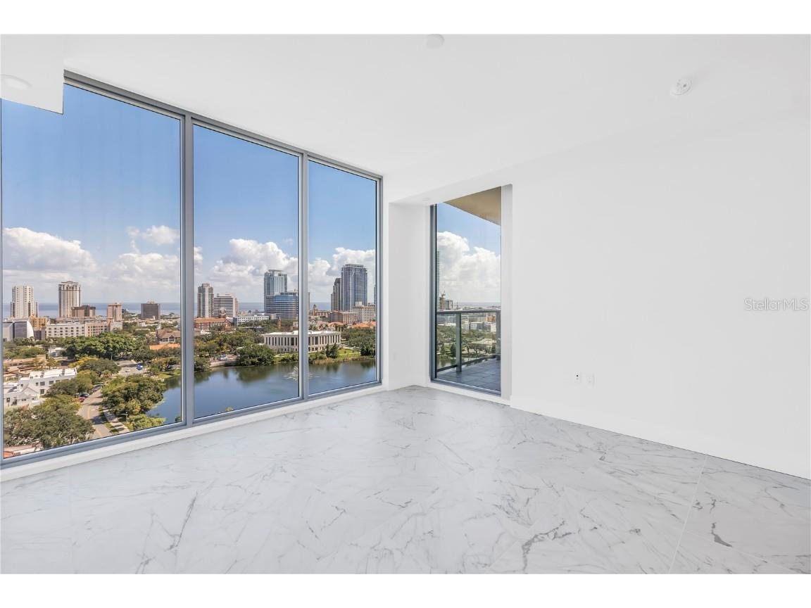 REFLECTION St. Pete introduces the Lapis residence—a stunning 16th-floor premier corner home that captures the essence of elevated downtown living. Spanning nearly 2,300 square feet, this 2-bedroom plus den, 2-bath residence showcases expansive floor-to-ceiling glass and a private terrace with sweeping, protected views of the city skyline, Mirror Lake, and Tampa Bay. With historic properties surrounding the building, the eastern lake views will remain unobstructed for years to come. Inside, the Lapis features 10-foot ceilings, upgraded porcelain tile floors, and a modern kitchen with quartz countertops, panel-ready Bosch appliances, and a Thermador wine fridge built into the kitchen island. A window over the sink frames tranquil lake and skyline views, while the open layout creates a seamless flow between living, dining, and outdoor spaces. The primary suite includes a European-style wet room, upgraded fixtures, and both reach-in and walk-in closets. The second bedroom is generously sized, and the den provides flexible space for a home office or guest room. Two assigned parking spaces are included. Residents enjoy exclusive access to a 12,000-sq-ft rooftop oasis with a heated saltwater pool and spa, glass-walled fitness center, social club, fire pit lounge, and outdoor kitchen—all set against panoramic city and bay views. Designed for both luxury and longevity, REFLECTION features REME Halo air filtration, a water softening system, and touchless entry. Its resilience through recent hurricanes showcases the building’s superior construction and lasting quality. Perfectly located just steps from Central Avenue’s dining, shopping, and arts scene, the Lapis residence offers the ultimate blend of sophistication, comfort, and protected panoramic views in the heart of downtown St. Petersburg.