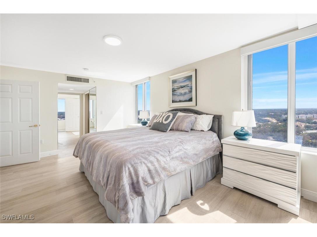 Experience breathtaking views from this luxurious 17th-floor, 3-bedroom, 2-bathroom condo in the highly desirable Pelican Bay, Naples—your ideal winter retreat. The living room features chic, comfortable furnishings and a large screen TV, perfect for relaxation. The open, airy kitchen offers plenty of cabinet and counter space for convenience and functionality. The primary suite is filled with natural light, with large windows and a full door wall opening to a screened lanai. It includes a king-sized bed, elegant wood floors, and a lavish en-suite bathroom featuring dual sinks, a walk-in shower, and a soaking tub with a stunning view. The guest bedrooms are equally inviting, with two full beds in one room and two twin beds in the other, sharing a well-appointed bathroom. 4 month minimum, per owner. Also available annually for $7,000/month beginning April 2025 Unwind on your open-air balcony with sweeping Gulf views. St. Laurent offers resort-style amenities such as a pool/spa area, tennis courts, BBQ, fitness room, library, billiards, and a social room. Pelican Bay adds even more to your lifestyle with private beachfront restaurants and bars, a beach shuttle, fitness classes, and a community center packed with activities. Getting to the beach from St Laurent is easy. You can step out of the building and catch the tram or enjoy a 10 minute walk through the mangrove on the boardwalk. All you need is your towel! Discover the best of Naples living and live exceptionally in Pelican Bay!